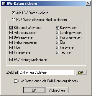 Wenn Sie diese Option wählen, werden die Daten aller Module gesichert. (Dateiname der Sicherung: hw_daten.mdb) | ||||||||||||||||||||||||||||