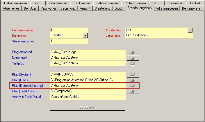 Voreinstellung des Zielpfades unter "Extras / HW-Parameter / Standortangaben"