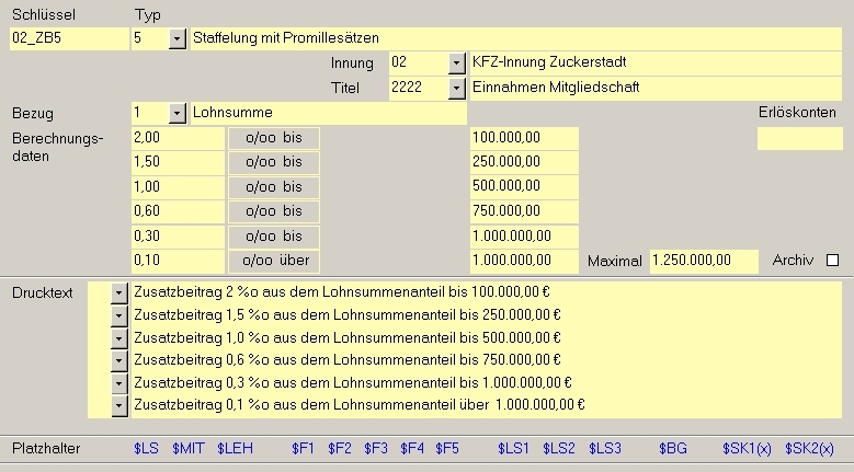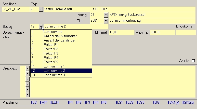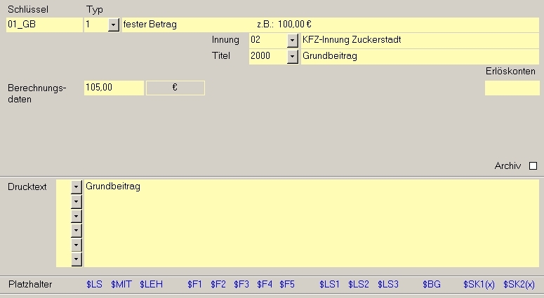| 1 | Fester Betrag: Hier wird ein fester Betrag berechnet, z.B. Grundbeitrag der Innung. |