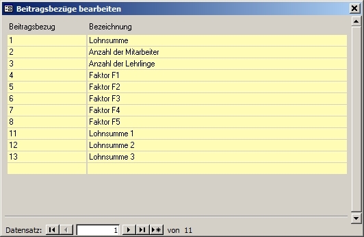 Hier können Sie die Beitragsbezüge bearbeiten und den Feldern "Faktor F1 - Faktor F5" eine Bezeichnung zuweisen bzw. bei "11-13" den Namen der Teillohnsumme eintragen.