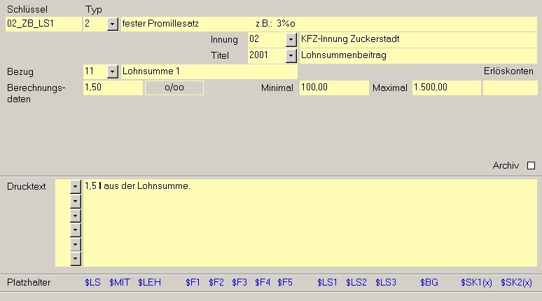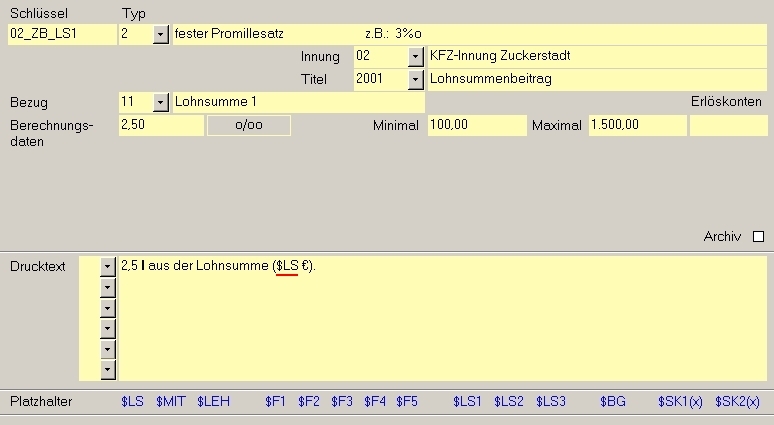 | $LS1 - $LS3 | Bei Verwendung werden die verschiedenen Lohnsummen, die Sie im Adresswesen unter "Adresse / Adressen / Beitragsdaten 2" eingeben können, in den Drucktext eingefügt. |