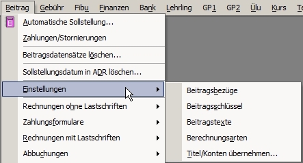 In diesem Menü können Sie verschiedene Einstellungen zum Beitragswesen vornehmen. Klicken Sie auf den gewünschten Menüpunkt, dann gelangen Sie zu dessen Beschreibung.