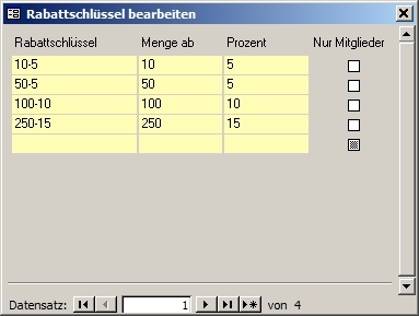 Hier können Sie Rabatte einstellen, d.h. ab Kauf einer gewissen Anzahl eines Artikels werden Preisnachlässe gewährt.