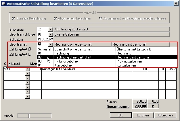 Hier kann als Gebührenart auch die entsprechende Rechnungsüberschrift ausgewählt werden.