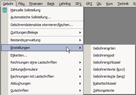 Hier werden alle wichtigen Einstellungen des Moduls "Gebühren" getätigt ( z.B. die Artikeldatenbank verwaltet).