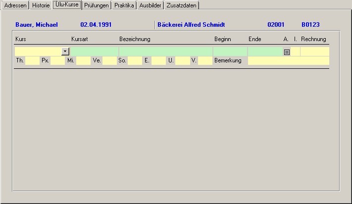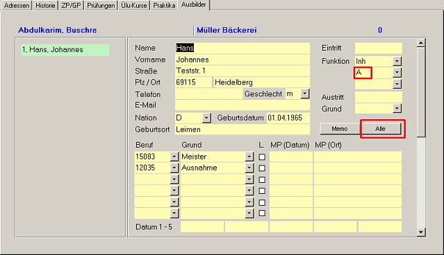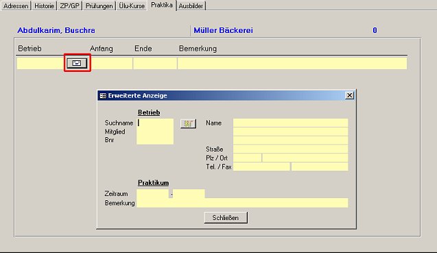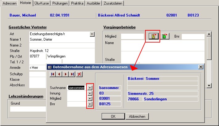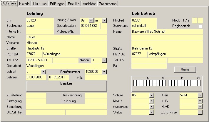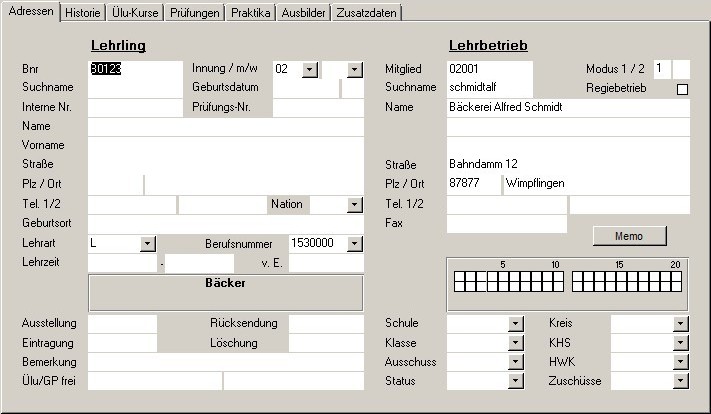 Nach Bestätigen der Auswahl werden im Formular "Lehrlinge / Adressen" die betriebsrelevanten Daten übernommen.