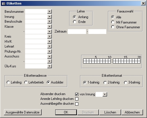 | Anrede Lehrling drucken: | Wenn Sie hier einen Haken setzen, wird die Anrede des Lehrlings mit auf den Adressaufkleber gedruckt (z.B. Herrn, Frau). (Dieses Feld ist nur wählbar, wenn Sie bei Etikettenadresse "Lehrling" gewählt haben.) | ||||