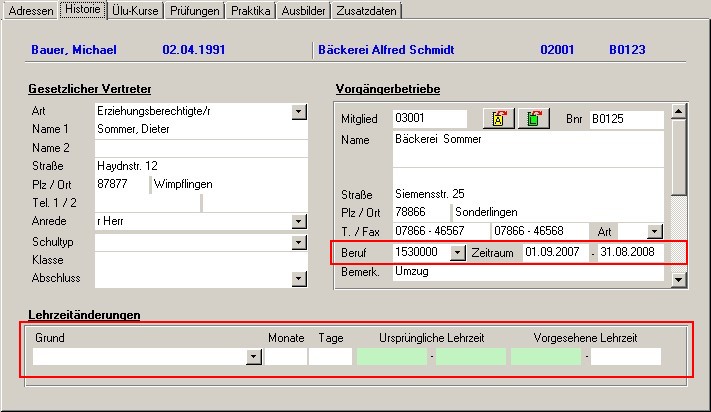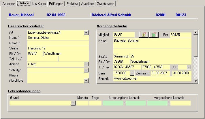 | Historie | Hier kann ein gesetzlicher Vertreter sowie alle Vorbetriebe des Lehrlings und alle Lehrzeitänderungsgründe hinterlegt werden. |