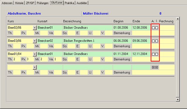 Nachfolgendes Bild zeigt den Karteireiter "Ülu-Kurse" mit angezeigten Bewertungsfeldern