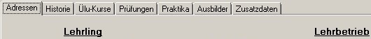 Das Menü "Lehrling / Lehrlinge" ist aufgeteilt in mehrere Karteireiter, in diesen werden bestimmte Informationen eines Lehrlings verwaltet.