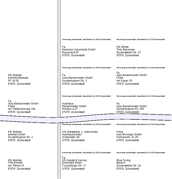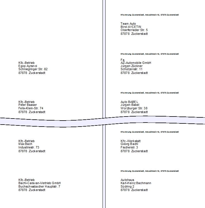 Hier im Beispiel sehen Sie den Druck ab Position 2. Wenn Sie ohne Absender gewählt haben, würde das ganze Blatt (DIN A4 Hochformat) aussehen wie die linke Spalte, mit Adressen würde das Blatt aussehen, wie die Spalte rechts.