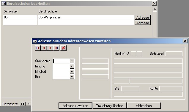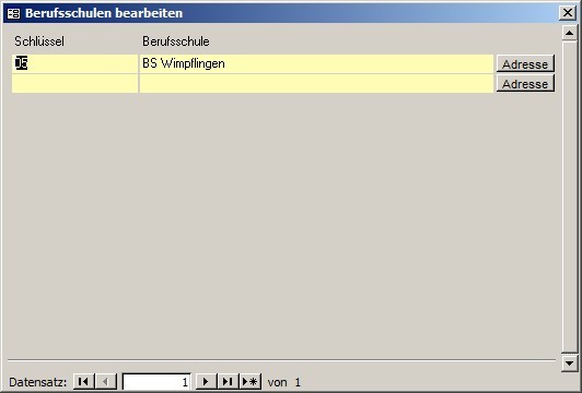 Hier können Sie die Ausbildungsstätten hinterlegen, die unter "Lehrling / Berufsschulen" dem Lehrling zugewiesen werden können. Wenn Sie im Adressenwesen die Berufschulen eingepflegt haben, können Sie die Zuweisung der einfach Berufschule über den "Adresse"-Schalter vornehmen.