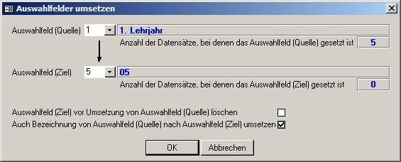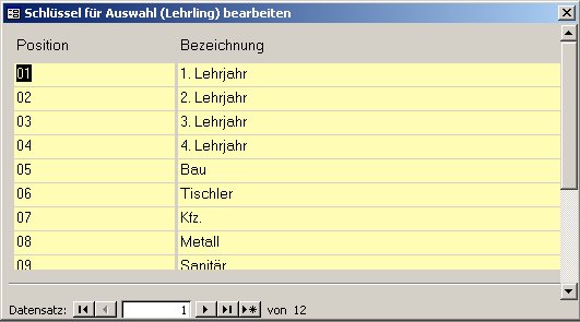 Hier können Sie Auswahlfelder verschieben bzw. umbenennen. Diese Änderung wird an allen Lehrlinge-Datensätzen vorgenommen und in der Auswahlliste (Schlüssel für Auswahl (Lehrlinge)) angepasst.