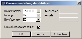 Mit diesem Menüpunkt haben Sie die Möglichkeit, ganze Klassen so umzustellen, das alle Lehrlinge, die sich im letzten Lehrjahr in der Klasse 1 befanden, in diesem Lehrjahr Klasse 2 besuchen.