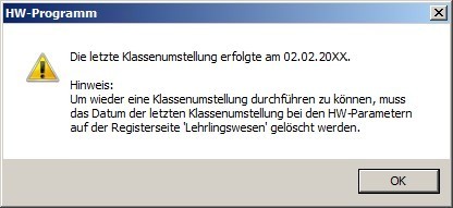 Ist also bereits ein Datum hinterlegt, kommt bei Auswahl des Menüpunktes "Klassenumstellung durchführen" folgende Fehlermeldung: