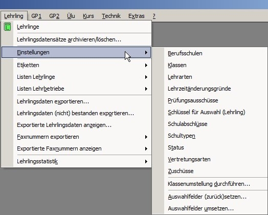 In diesem Menüpunkt können spezifische Einstellungen für das Lehrlingswesen vorgenommen werden. Klicken Sie im folgenden Bild auf den gewünschten Menüpunkt, dann gelangen Sie direkt zu dessen Beschreibung.
