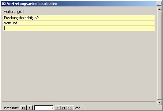 Hier können Sie verschiedene gesetzliche Vertreterarten hinterlegen, die Sie im Datensatz von minderjährigen Lehrlingen mit angeben sollten.