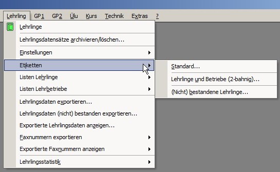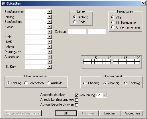 Mit diesem Menüpunkt können Sie Adressetiketten der Lehrlinge und Lehrbetriebe drucken.