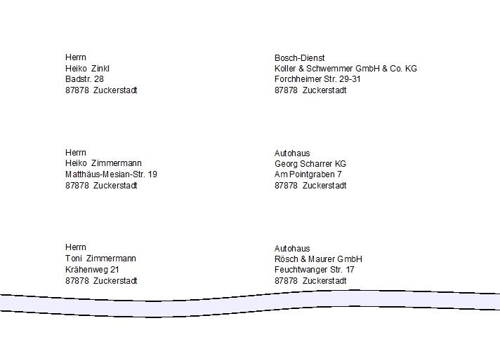 Hier im Beispiel sehen Sie den Druck ab Position 2. Wenn Sie ohne Absender gewählt haben, würde das ganze Blatt (DIN A4 Hochformat) aussehen wie die linke Spalte, mit Adressen würde das Blatt aussehen, wie die Spalte rechts.