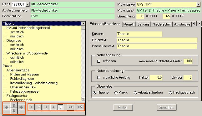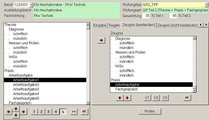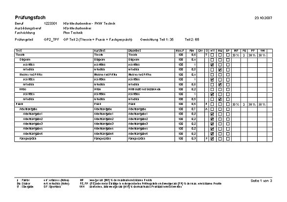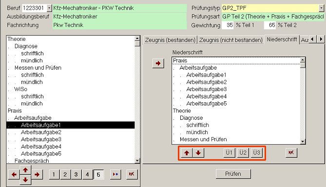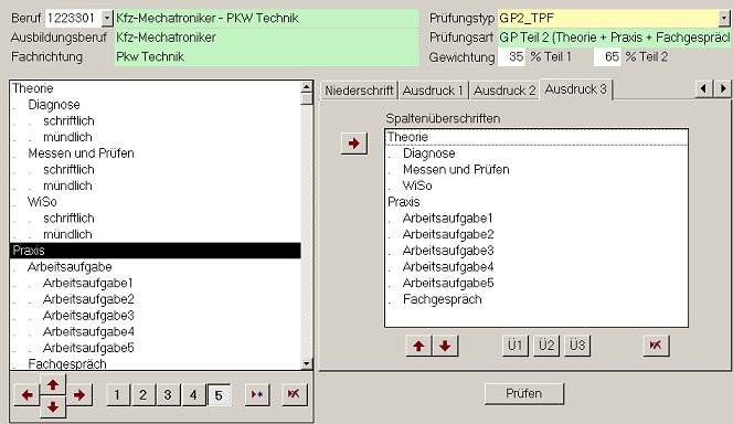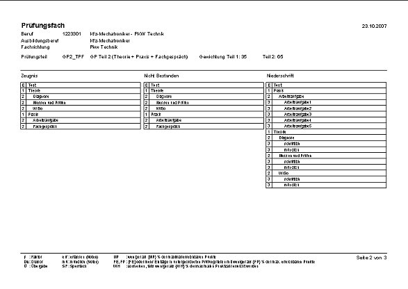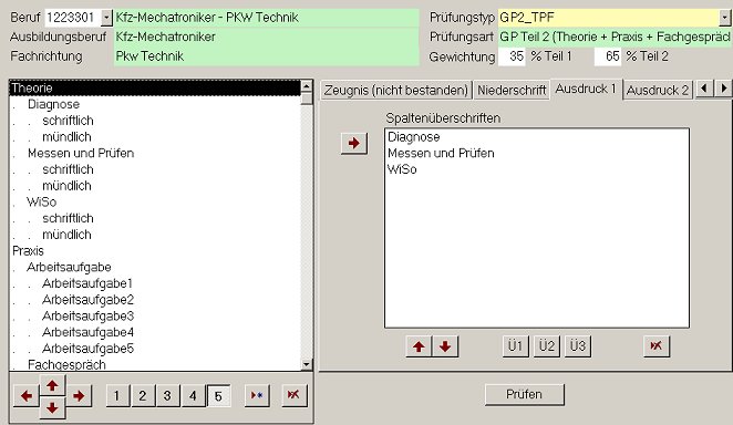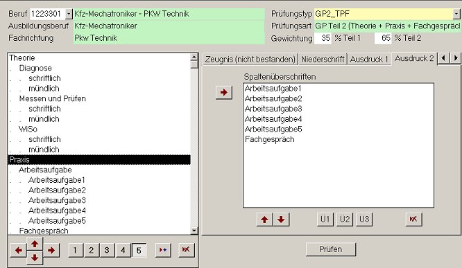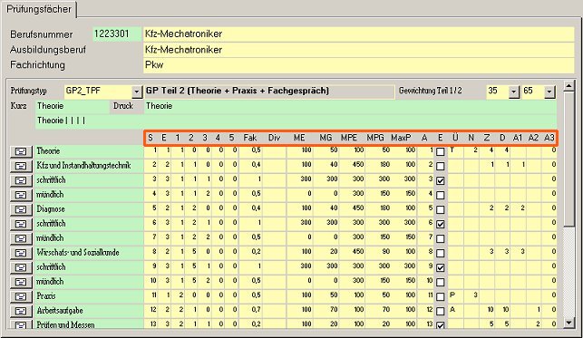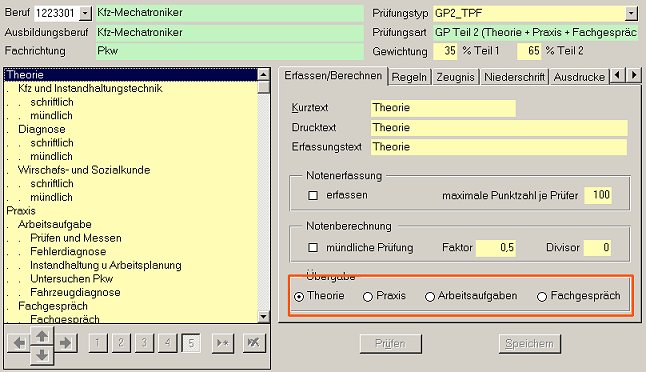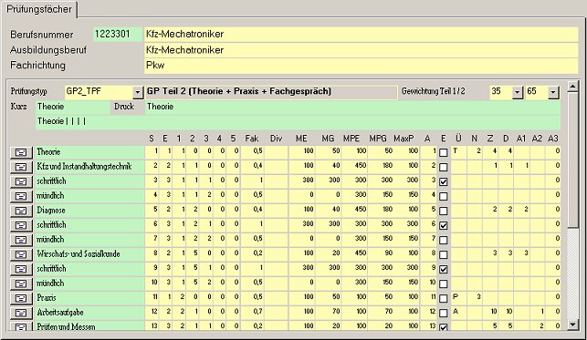 | Ü | Übergabe an Prüfungen: T = Theorie, P = Praxis, F = Fachgespräch, G = Gesamt. Hierbei handelt es sich um eine Festlegung, welches Ergebniss von welchem Fach wo im Zeugnis / in den Ausdrucken eingetragen wird. |