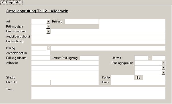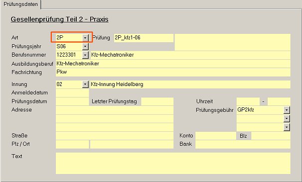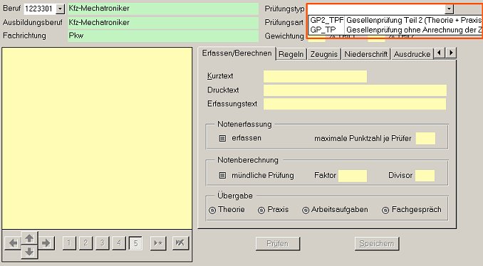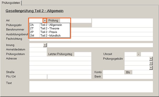 | Art: | Hier wird die Prüfungsart ausgewählt (Allgemein, Theorie bzw. Praxis, siehe nächstes Bild) |