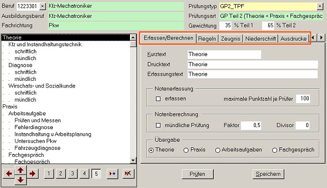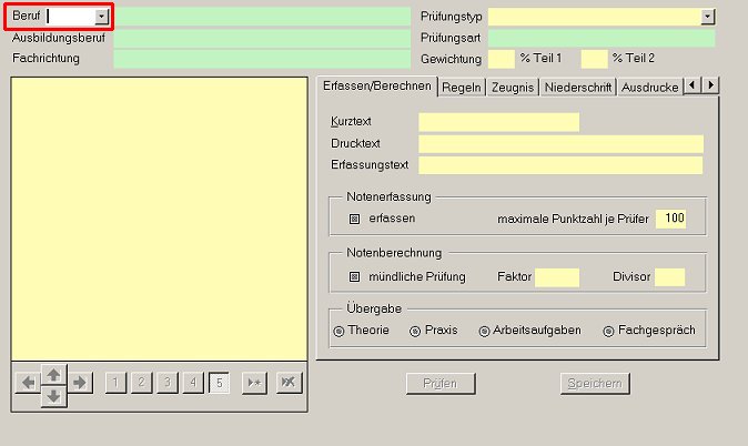 Hier haben Sie die Möglichkeit, für jeden Beruf die Prüfungen einzustellen, Prüfungsfächer einzugeben, die Gewichtung der Fächer einzustellen, festzulegen, was wie auf Zeugnisse und Niederschriften gedruckt werden soll.