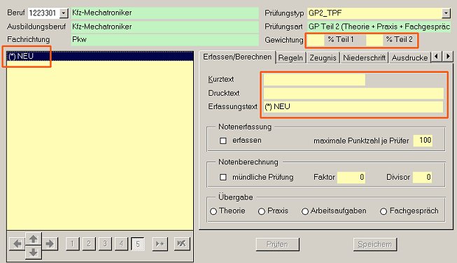 Handelt es sich um eine Prüfung nach neuer Prüfungsordnung, wählen Sie bitte "GP2_TPF" - Teil 2 mit Eingabe der Theorie, Praxis und Fachgespräch - aus, (neue Prüfungsordnung) und in diesem Beispiel werden Sie dies tun.