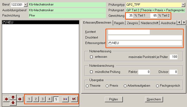 | Prüfung: | Im vorderen Teil wird ein Kurzwort für die Prüfung hineingeschrieben, im hinteren Teil die ausführliche Bezeichnung. |