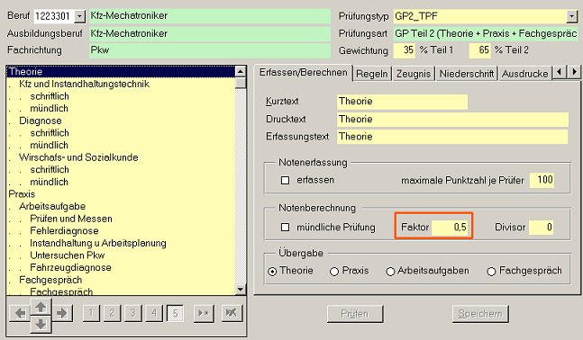 | Fak | Gewichtungsfaktor innerhalb der Ebene. So werden zum Beispiel Arbeitsaufgabe und Fachgespräch mit 0,7 und 0,3 innerhalb ihrer Ebene gewichtet: Die übergeordnete Ebene wäre Praxis, was an den Zahlen der Ebenen erkennbar ist. |