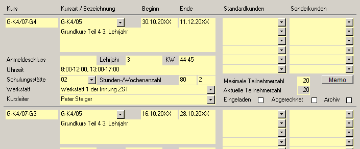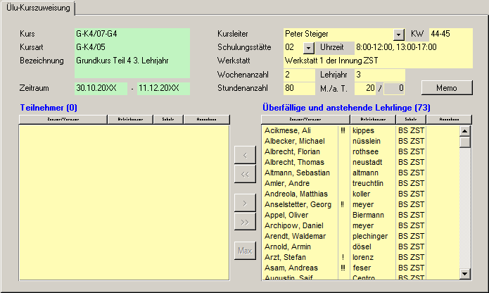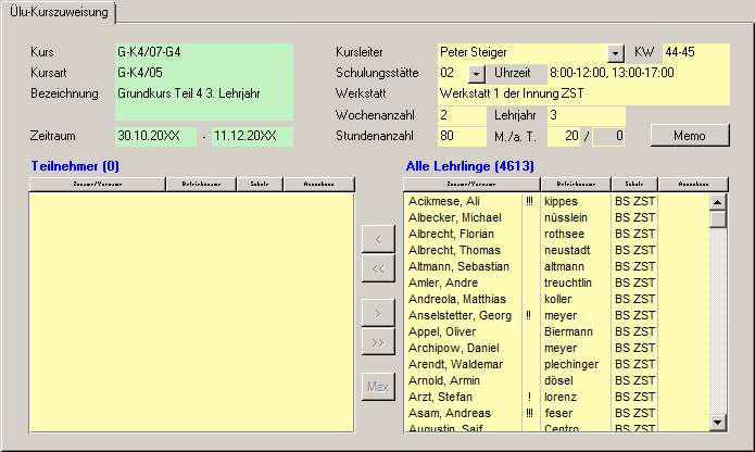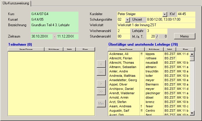 Haben Sie in einem Kurs eine maximale Teilnehmerzahl festgelegt und rechts sind mehr Lehrlinge vorhanden, als in dem Kurs Platz hätten, werden automatisch dem Kurs so viele Lehrlinge zugewiesen, bis der Kurs voll belegt ist. (Beginnend mit dem ersten Lehrling der Liste.) |