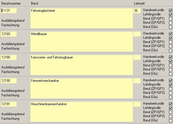 In der hinteren Spalte kann die Lehrzeit in Monaten eingetragen werden.