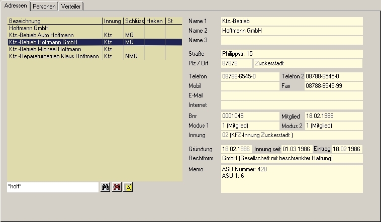 Die Schnellsuche ermöglicht Ihnen ein komfortableres Finden bestimmter Datensätze, da Sie eine Übersicht der noch zur Auswahl stehenden Datensätze sehen. Durch verfeinern der Kriterien können Sie so lange filtern, bis Sie den gesuchten Datensatz mit einem Doppelklick öffnen können. Durch die Eingabe von "Adressen / Einstellungen / Texte für Schnellsuche" können Sie die Handhabung weiter vereinfachen. Ihnen werden dann die Kürzel, die Sie festgelegt haben, eingeblendet, so dass Ihnen die Zuordnung der Betriebe / Personen leichter fällt.