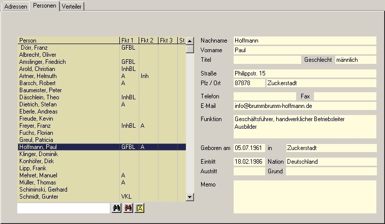 Auswahlbasierte Suche (Betriebsperson) | Es öffnet sich ein Fenster, in dem tabellarisch Informationen wie z.B. Suchname, Ig. (Innung), Straße, Plz, Ort, F. (Funktion), Mitglied(~snummer) und Sname (B.) (Suchname Betriebsperson) angegeben sind. Durch das Ausfüllen der Suchfelder können Sie die angezeigten Daten filtern und so bis zu dem gewünschten Datensatz reduzieren. Durch Doppelklick auf den gesuchten Datensatz schließt sich das Suchfenster und die Detailansicht des Datensatzes öffnet sich. | ||||||